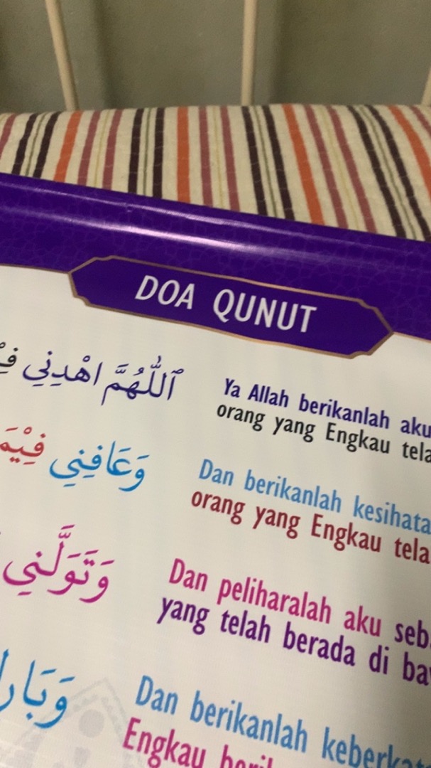 Maksud doa qunut dalam bahasa melayu. Mohon terjemahan doa qunut nazilah ini semoga kita semua dapat. Apakah maksud dan fadilat disebalik bacaan doa qunut ini? Membaca doa qunut nazilah sahaja sepertimana yang di dalam lampiran 3. Berikut adalah bacaan doa qunut dalam bahasa arab (jawi), latin (rumi) dan terjemahannya.